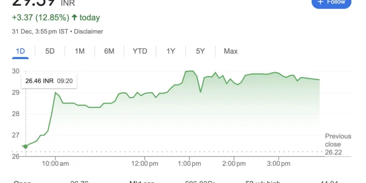 - दिन का कारोबार समाप्त होने तक ये 13.27% की बढ़त के साथ 29.70 रुपये पर बंद हुए।