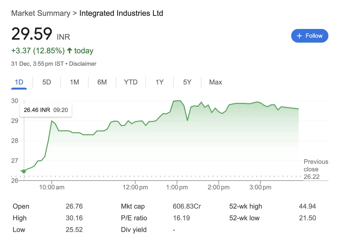 31 दिसंबर को इंटीग्रेटेड इंडस्ट्रीज के शेयर बाजार में जबरदस्त तेजी देखने को मिली।