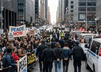 New York City के मैनहट्टन इलाके में इजरायल को अमेरिकी बमों की बिक्री रोकने और ईरान के साथ युद्ध खत्म...