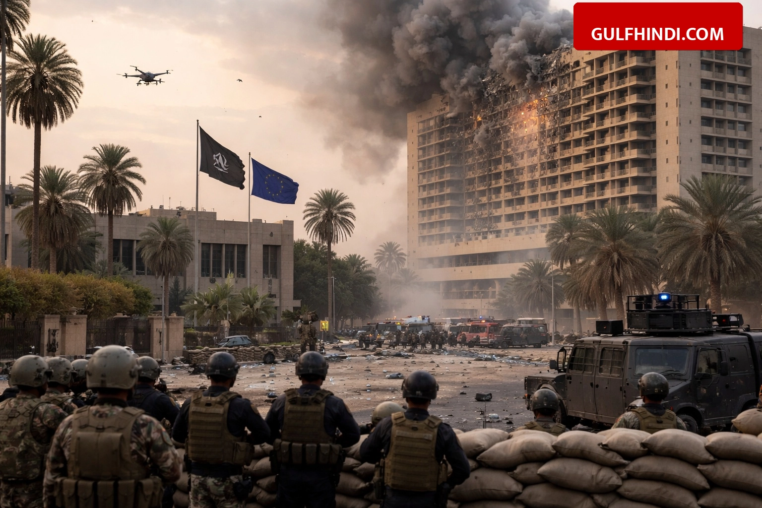 इराक की राजधानी बगदाद के सुरक्षित माने जाने वाले ग्रीन ज़ोन में स्थित अल-रशीद होटल पर 16 मार्च 2026 की शाम को एक ड्रोन से हमला किया गया। यह होटल यूरोपीय संघ (EU) और सऊदी अरब के राजनयिक मिशनों का मुख्य ठिकाना है। इराक के गृह मंत्रालय के अनुसार, ड्रोन होटल की ऊपरी मंजिल से टकराया जिससे वहां आग लग गई थी, जिसे सिविल डिफेंस ने समय रहते काबू में कर लिया।