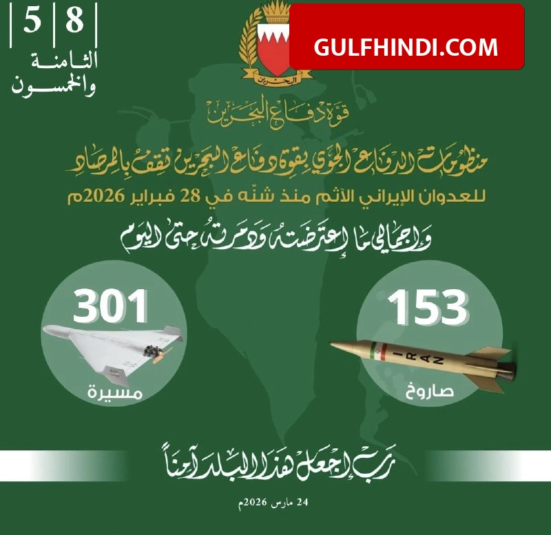 Bahrain Defense Force की जनरल कमांड ने 24 मार्च 2026 को आधिकारिक तौर पर जानकारी साझा की है। आंकड़ों के अनुसार, हमलों की शुरुआत से अब तक कुल 153 मिसाइलों और 301 ड्रोन को सफलतापूर्वक बीच में ही रोककर नष्ट कर दिया गया है। पिछले कुछ दिनों में इन हमलों की संख्या में लगातार बढ़ोतरी देखी गई है। सेना ने इन हमलों को अंतरराष्ट्रीय कानूनों और संयुक्त राष्ट्र चार्टर का उल्लंघन बताया है। इन हमलों से क्षेत्रीय शांति और सुरक्षा को सीधा खतरा पैदा हो गया है।