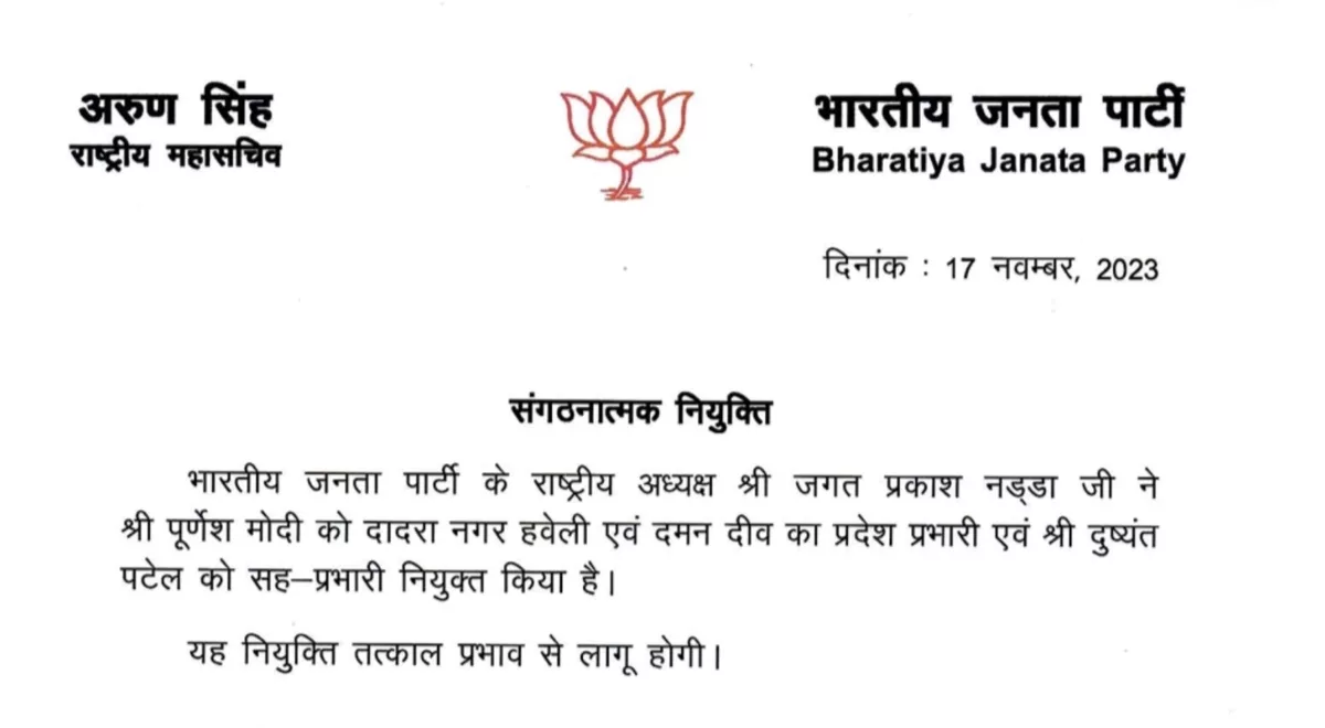 पूर्णेश मोदी को दादरा नगर हवेली और दमन दीव का प्रदेश प्रभारी नियुक्त किया गया है। वह इस नगर हवेली क्षेत्र के लिए अब से संगठनात्मक दायित्वों का ध्यान रखेंगे। दुष्यंत पटेल को सह-प्रभारी नियुक्त किया गया है और वह पूर्णेश मोदी के साथ मिलकर काम करेंगे। इन नये प्रभारी नियुक्तियों से भाजपा की संगठनात्मक मजबूती और कार्य क्षमता में सुधार होने की उम्मीद है।