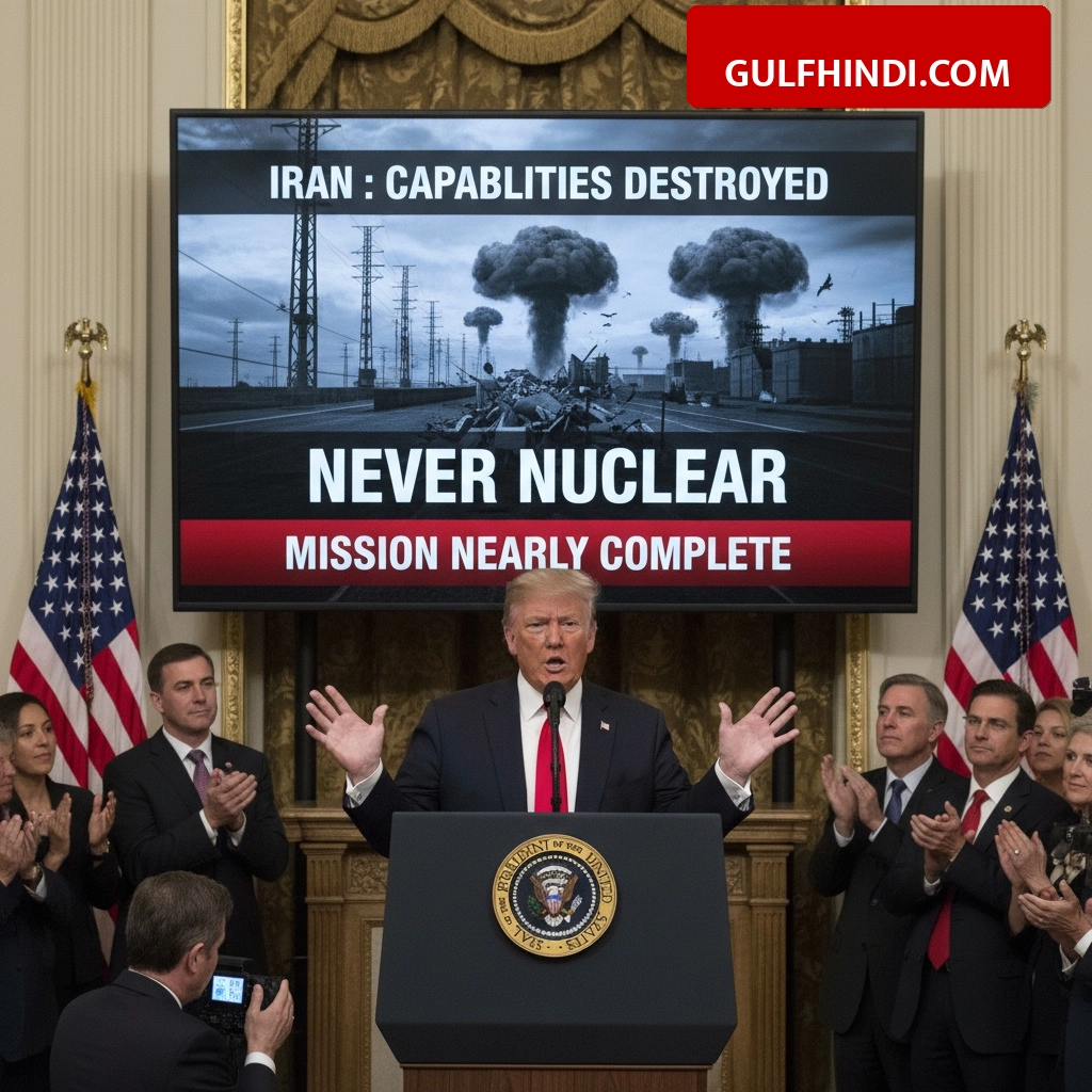 अमेरिकी राष्ट्रपति Donald Trump ने ईरान के साथ चल रहे संघर्ष को लेकर एक बहुत बड़ी घोषणा की है। ट्रंप का कहना है कि अमेरिकी सेना ने ईरान की सैन्य क्षमताओं और उसके परमाणु प्रोजेक्ट को पूरी तरह से तबाह कर दिया है। उन्होंने साफ शब्दों में कहा कि अब ईरान कभी भी परमाणु हथियार हासिल नहीं कर पाएगा। खाड़ी देशों में रहने वाले प्रवासियों और भारतीयों के लिए यह खबर काफी अहम है, क्योंकि इस तनाव का सीधा असर पूरे मिडिल ईस्ट की सुरक्षा और वहां के माहौल पर पड़ रहा है।