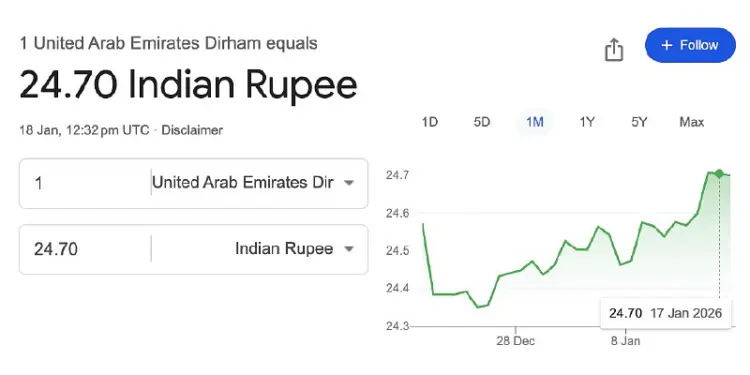 भारतीय रुपया विदेशी मुद्रा बाजार में लगातार दबाव का सामना कर रहा है और अब यह यूएई दिरहम (UAE Dirham) के मुकाबले 25 रुपये के मनोवैज्ञानिक स्तर के बेहद करीब पहुंच गया है। बाजार के जानकारों के अनुसार, रुपये में आई यह गिरावट खाड़ी देशों में रहने वाले भारतीयों के लिए रेमिटेंस (Remittance) के लिहाज से फायदेमंद साबित हो सकती है।