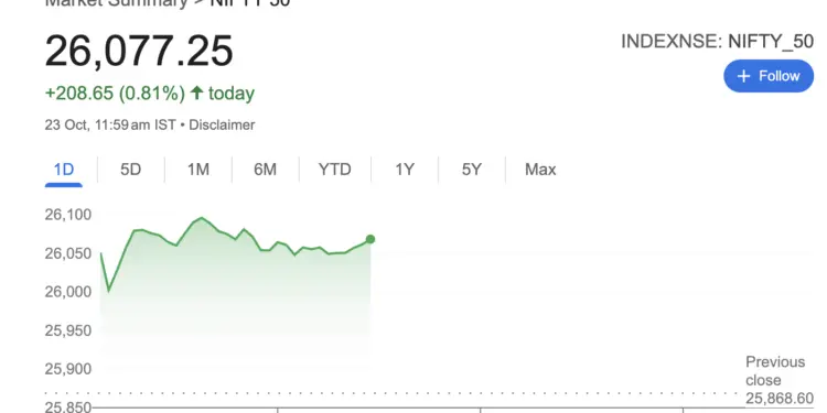 गुरुवार सुबह शेयर बाज़ार ने तेज शुरुआत की। Sensex 787.90 अंकों की बढ़त के साथ 85,214.24 पर और Nifty 215.30 अंकों की उछाल के साथ 26,088.50 पर पहुंच गया।