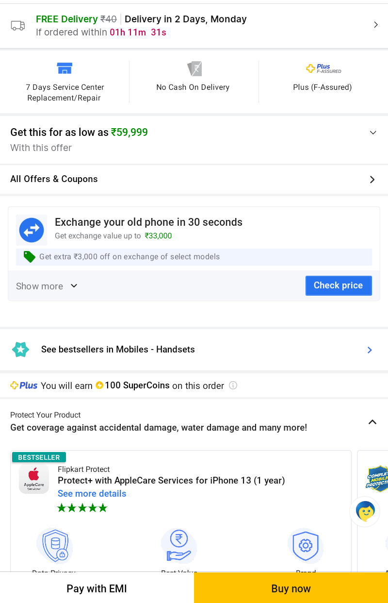 Apple iPhone 13 पर Flipkart की तरफ से एक्सचेंज ऑफर का भी लाभ दिया जा रहा है जिसके बाद इसकी कीमत और कम हो जाती है। एक्सचेंज ऑफर पर आप Rs 33,000 तक बचा सकते हैं। इन सभी discount offer का लाभ उठाने के बाद स्मार्टफोन की कीमत आधी हो जायेगी।