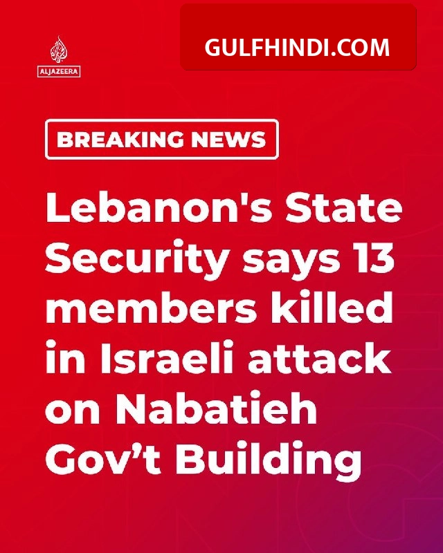 इसराइल ने शुक्रवार 10 अप्रैल 2026 को नबातियेह में स्थित एक सरकारी इमारत पर हमला किया। लेबनान के राष्ट्रपति Joseph Aoun ने पुष्टि की है कि इस हमले में सुरक्षा एजेंसी के 13 सदस्य मारे गए हैं। शुरुआत में नेशनल न्यूज़ एजेंसी ने यह संख्या 8 बताई थी, जिसे बाद में अपडेट कर 12 और फिर 13 कर दिया गया। इस हमले से सरकारी इमारत को काफी ज्यादा नुकसान पहुँचा है।