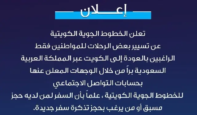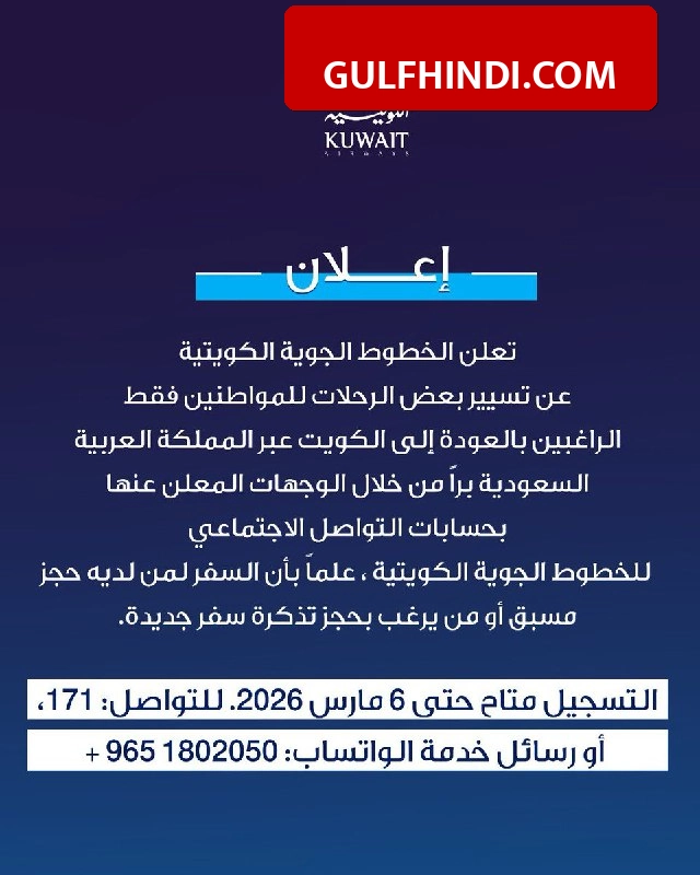 क्षेत्रीय तनाव और एयरस्पेस की पाबंदियों के बीच कुवैत एयरवेज ने विदेशों में फंसे अपने नागरिकों के लिए बड़ी राहत की घोषणा की है। एयरलाइन ने कुवैती नागरिकों को वापस लाने के लिए विशेष उड़ानों का संचालन शुरू किया है। यह सुविधा उन लोगों के लिए है जो सऊदी अरब के रास्ते सड़क मार्ग से कुवैत लौटना चाहते हैं। इसके लिए पंजीकरण की प्रक्रिया शुरू हो चुकी है और नागरिक 6 मार्च 2026 तक अपना आवेदन कर सकते हैं।
