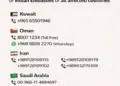 सरकार ने नागरिकों और वहां रहने वाले प्रवासियों की सुविधा के लिए आधिकारिक हॉटलाइन नंबर जारी किए हैं। इन नंबरों पर 24 घंटे संपर्क किया जा सकता है।