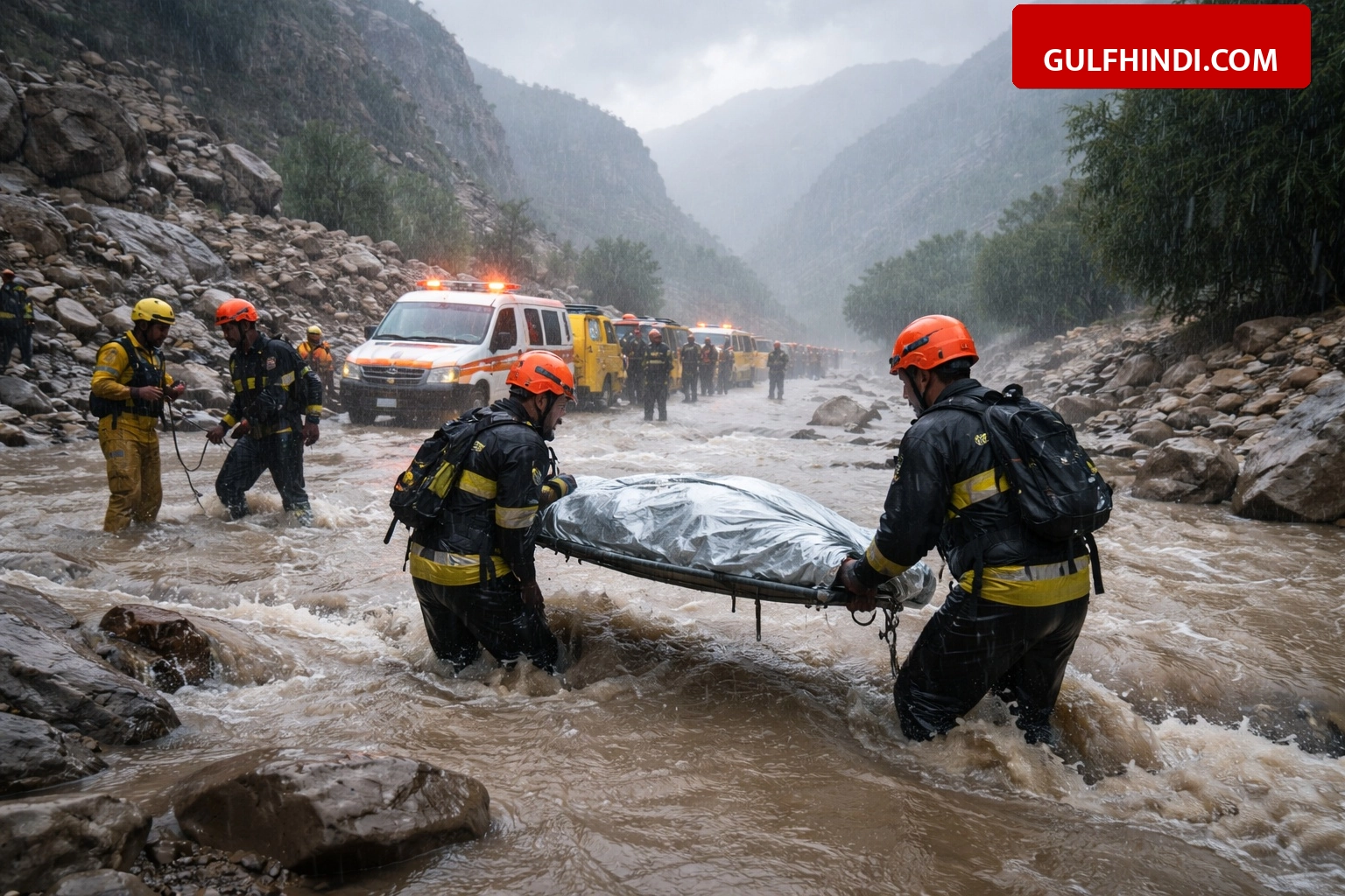 सर्च और रेस्क्यू टीमों ने 24 मार्च 2026 को खसाब में महिला के शव को खोज निकाला। ओमान में 20 मार्च से 30 मार्च 2026 के बीच भारी बारिश और गरज के साथ तूफान का अलर्ट जारी किया गया था। इस दौरान कई वादियों में अचानक बाढ़ (Flash Floods) जैसे हालात पैदा हो गए थे। सिविल डिफेंस एंड एम्बुलेंस अथॉरिटी (CDAA) ने बताया कि खसाब में यह हादसा तब हुआ जब महिला वादी के तेज बहाव की चपेट में आ गई थी।