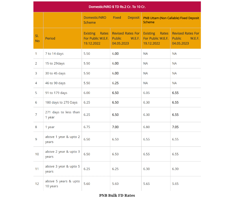 Punjab National Bank (PNB) ग्राहकों को खुशखबरी है क्योंकि बैंक ने फिक्स डिपॉजिट पर ब्याज दरों में बढ़ोतरी की घोषणा की है। नई ब्याज दरें 2 करोड़ से लेकर 5 करोड़ की रकम पर लागू होगा। बैंक की आधिकारिक वेबसाइट के मुताबिक नई ब्याज दरें 4 मई 2023 से लागू होंगी।