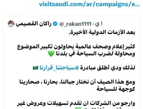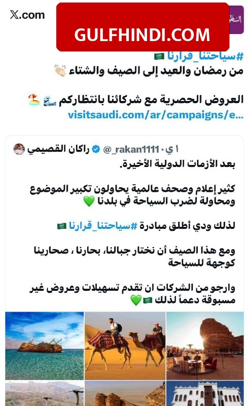 सऊदी अरब में गर्मियों की छुट्टियों को लेकर एक नई पहल की शुरुआत की गई है। लोकल न्यूज़ प्लेटफॉर्म SaudiNews50 ने 16 मार्च 2026 को #OurTourism_Our_Decision (#سياحتنا_قرارنا) नाम से एक अभियान शुरू किया है। इसका मुख्य मकसद नागरिकों और प्रवासियों को गर्मियों में विदेश जाने के बजाय सऊदी अरब के अंदर ही पर्यटन स्थलों पर घूमने के लिए प्रेरित करना है। इसके साथ ही पर्यटन एजेंसियों से सस्ती फ्लाइट और होटल पैकेज देने की मांग की गई है ताकि आम परिवार आसानी से घूम सकें।