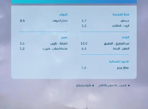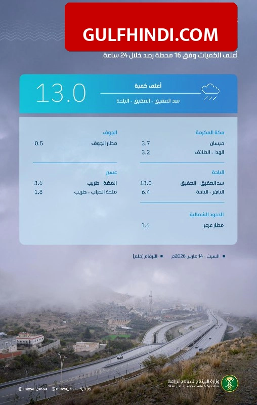 • अल-बाहा के अल-अकीक में सर्वाधिक 13.0 mm पानी गिरा है।