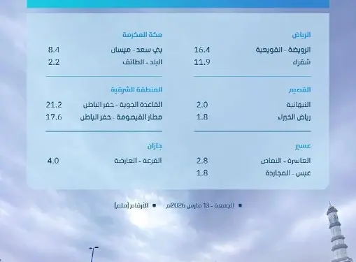 मंत्रालय की रिपोर्ट के मुताबिक, रियाद, मक्का, अल-कासिम, पूर्वी प्रांत समेत 8 अलग-अलग क्षेत्रों में बारिश का असर देखने को मिला है। नीचे दिए गए टेबल में आप देख सकते हैं कि किस इलाके में कितनी बारिश रिकॉर्ड की गई: