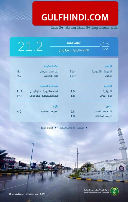 सऊदी अरब के कई हिस्सों में मौसम ने अचानक करवट ली है। Akhbar24 की ताजा रिपोर्ट के अनुसार, देश के Hafar al-Batin इलाके में सबसे ज्यादा 21.2 mm बारिश दर्ज की गई है। पर्यावरण, जल और कृषि मंत्रालय (MEWA) ने कुल 8 क्षेत्रों के लिए बारिश का डेटा जारी किया है। भारी बारिश और तेज हवाओं को देखते हुए मौसम विभाग (NCM) और सिविल डिफेंस ने स्थानीय नागरिकों और वहां काम करने वाले प्रवासियों के लिए खास चेतावनी जारी की है।