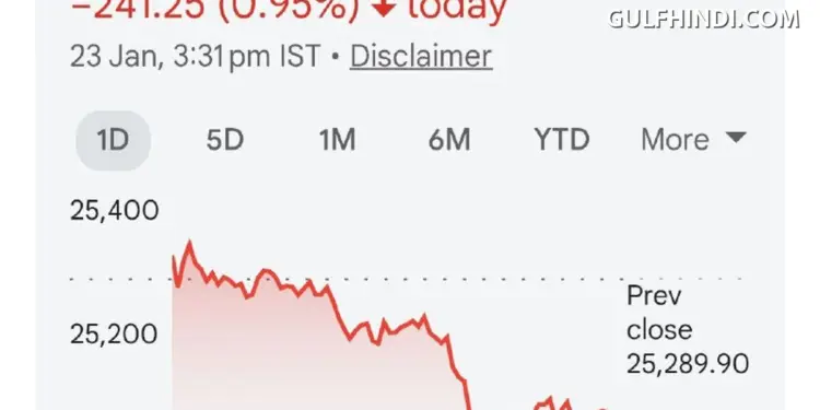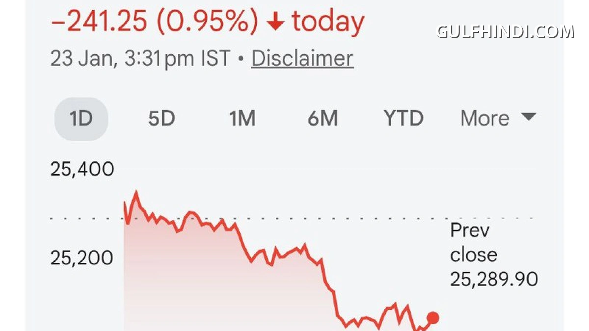 भारतीय शेयर बाजार के लिए 23 जनवरी का दिन काफी भारी साबित हुआ। निफ्टी 50 इंडेक्स 241.25 अंकों की बड़ी गिरावट के साथ 25,048.65 के स्तर पर बंद हुआ। सुबह बाजार खुलने के बाद से ही बिकवाली का दबाव देखने को मिला, जिससे निवेशकों में मायूसी छा गई।