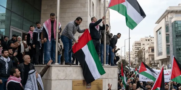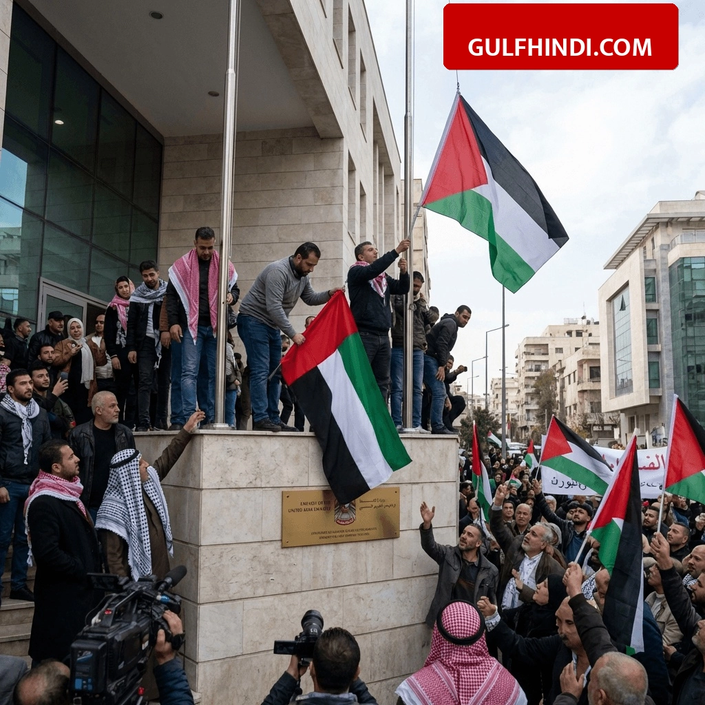सीरिया में प्रदर्शनकारियों ने UAE दूतावास से हटाया झंडा, फिलिस्तीन का झंडा लगाया, दमिश्क में हुआ बड़ा विरोध प्रदर्शन
