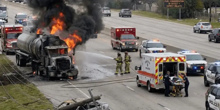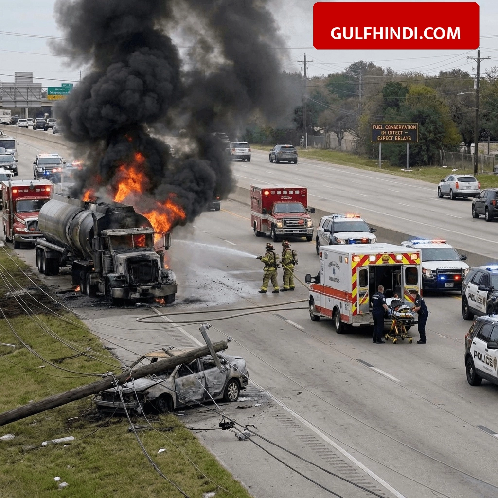 अमेरिका के टेक्सास में एक भयानक सड़क हादसे के बाद पेट्रोल से भरा ट्रक आग का गोला बन गया. इस घटना में 34,000 लीटर पेट्रोल जलकर खाक हो गया और ट्रक का ड्राइवर ज़िंदगी और मौत के बीच जूझ रहा है. यह हादसा फोर्ट वर्थ के पास हुआ जहाँ एक गाड़ी से टक्कर के बाद बिजली के तार ट्रक पर गिर गए और देखते ही देखते सब कुछ जलने लगा.