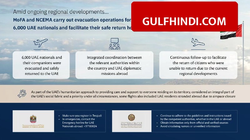 संयुक्त अरब अमीरात (UAE) के विदेश मंत्रालय (MoFA) और राष्ट्रीय आपातकालीन संकट और आपदा प्रबंधन प्राधिकरण (NCEMA) ने 14 मार्च 2026 को एक बड़ा रेस्क्यू ऑपरेशन पूरा किया। अधिकारियों ने करीब 6,000 UAE नागरिकों और उनके साथियों को सुरक्षित उनके घर वापस पहुंचा दिया है। इन लोगों को जमीन और हवाई रास्तों के जरिए देश में लाया गया। इस रेस्क्यू ऑपरेशन में देश के नागरिकों के साथ-साथ कुछ ऐसे निवासी भी शामिल थे जो हवाई क्षेत्र बंद होने के कारण विदेशों में फंसे हुए थे। सरकार ने साफ किया है कि देश का रेस्क्यू सिस्टम पूरी तरह से काम कर रहा है और सभी लोग सुरक्षित हैं।