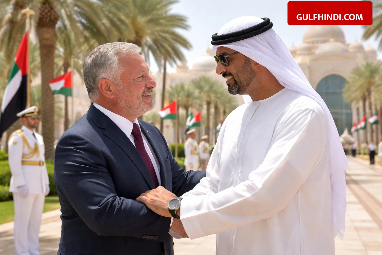 अबू धाबी में 16 मार्च 2026 को UAE के राष्ट्रपति हिज हाइनेस शेख मोहम्मद बिन जायद अल नाहयान और जॉर्डन के किंग अब्दुल्ला द्वितीय के बीच एक खास मुलाकात हुई. इस बैठक में दोनों देशों के बीच आपसी संबंध और मिडिल ईस्ट की वर्तमान स्थिति पर विस्तार से बातचीत की गई. ईद अल-फितर से ठीक पहले हुई इस मुलाकात में दोनों नेताओं ने अरब और इस्लामिक देशों की शांति के लिए एक-दूसरे को बधाई भी दी.