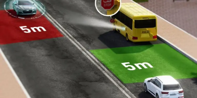जब भी स्कूल बस का साइड वाला “STOP” साइन/आर्म खुला हो, गाड़ी चलाने वालों को बस से कम से कम 5 मीटर दूर रुकना ज़रूरी है।