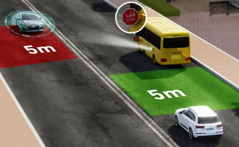 अबूधाबी समेत कई अमीरात में स्कूल बसों पर स्पेशल रडार / कैमरा सिस्टम लगे हैं, जो ऑटोमैटिकली उन गाड़ियों का नंबर रिकॉर्ड करते हैं जो STOP साइन पर नहीं रुकतीं या 5 मीटर गैप नहीं रखतीं।