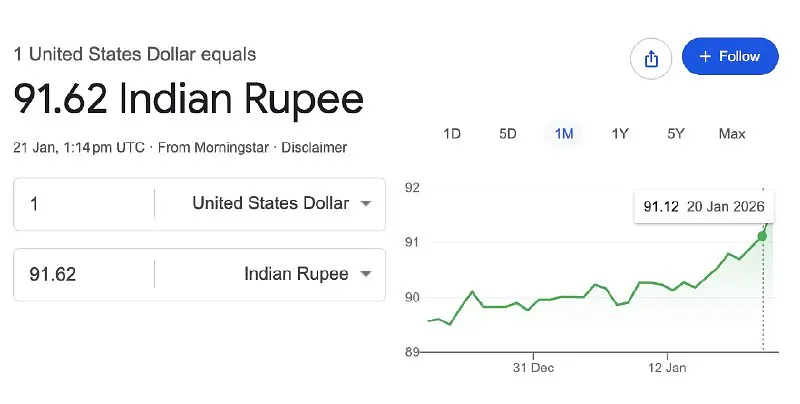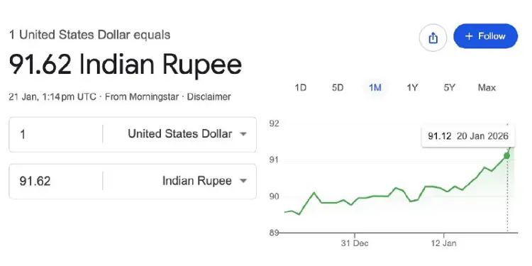 आज 21 जनवरी 2026 को USD INR 91.62, AED 24.81, KWD 298.20 पर, जानें पूरी स्थिति